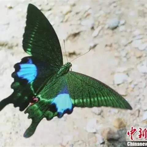 蓝凤蝶,Papilio protenor Cramer,凤蝶科凤蝶属的一种昆虫。翅展95~120mm。翅黑色,有靛蓝色天鹅绒光泽。雄蝶后翅正面前缘有黄白色斑纹,臀角有外围红环的黑斑;后翅反面外缘有几个弧形红斑,臀角具3个红斑。中国有3亚种。