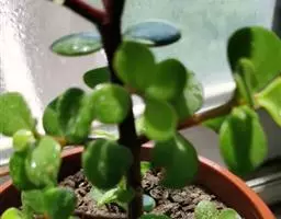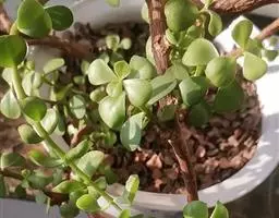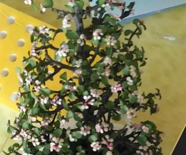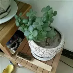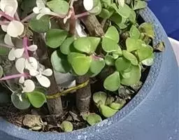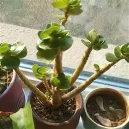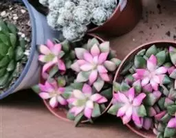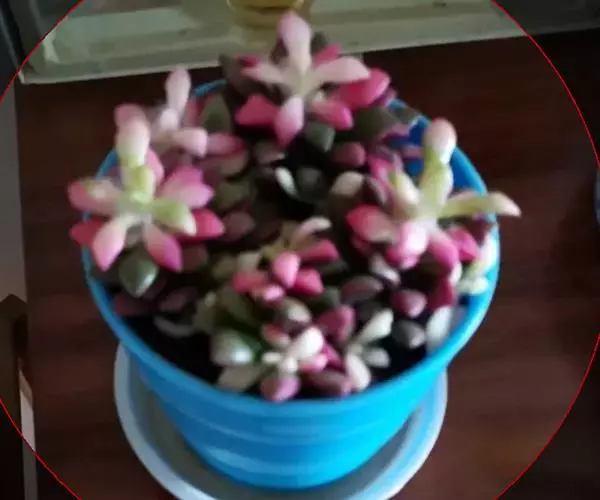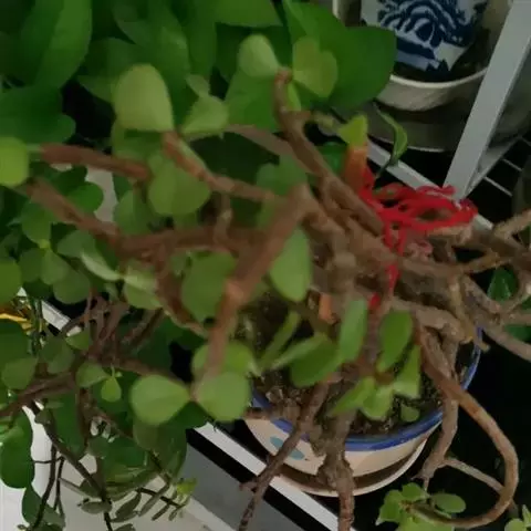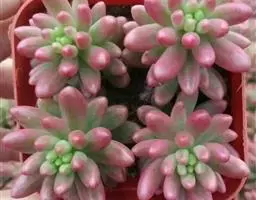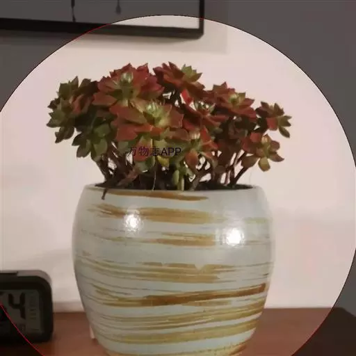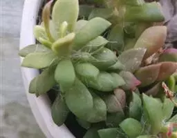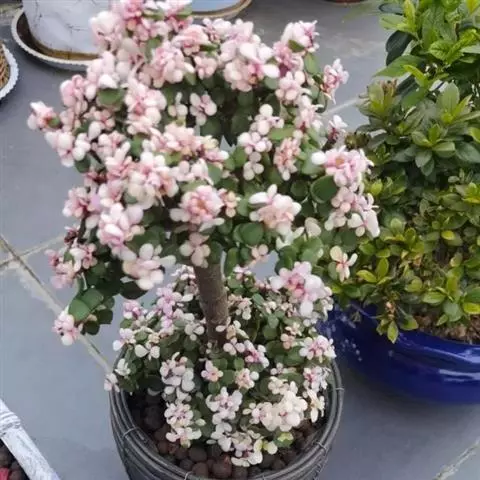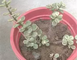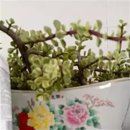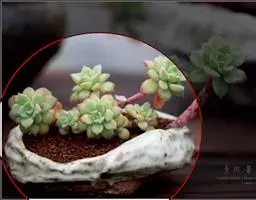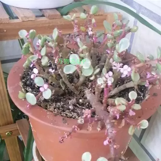 株高3~4米,老茎紫褐色,嫩枝紫红色,分枝近水平,肉质叶对生, 多肉植物雅乐之舞 绿色,倒卵形。雅乐之舞植株较矮,枝条也较为细弱,肉质茎红褐色(新茎)或灰白色(老茎):肉质叶交互对生,叶片大部分为黄白色,只有中央的一小部分为淡绿色;小花的边为淡粉色。