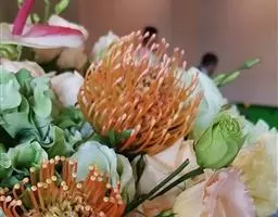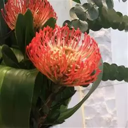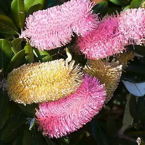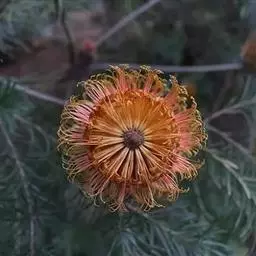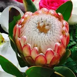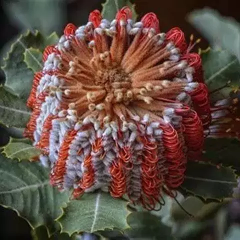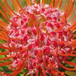 帝王花,山龙眼科帝王花属多年生常绿灌木植;茎干粗壮,叶色翠绿光亮;花朵呈圆球状;其苞片有的完全打开,…
