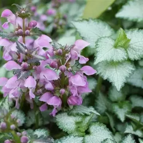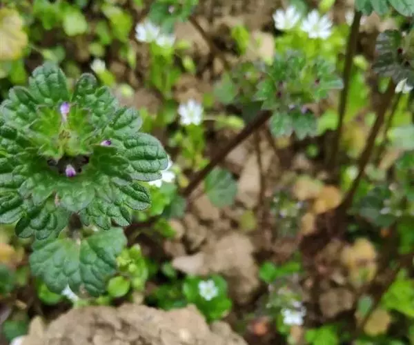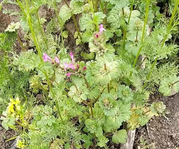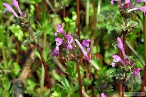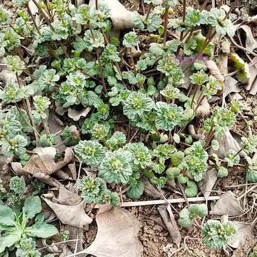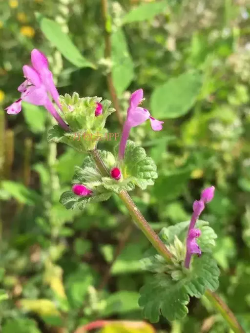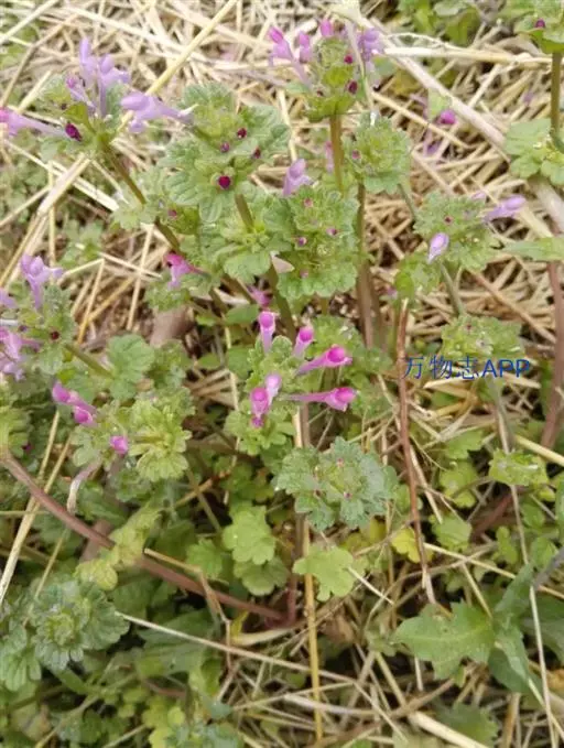 宝盖草(学名:Lamium amplexicaule L.)又名:珍珠莲、接骨草、莲台夏枯草等,属管状花目,唇形科一年生或二年生植物。茎高10-30厘米,基部多分枝,常为深蓝色。茎下部叶具长柄,柄与叶片等长或超过之,叶片均圆形或肾形,基部截形或截状阔楔形,半抱茎,边缘具极深的圆齿,花期3-5月,果期7-8月。