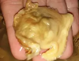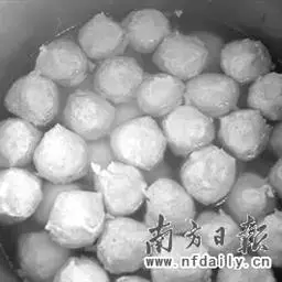 3、一手抓墨鱼胶,从拇指虎口处挤出小团,另一手使汤匙将鱼胶刮下,放进生油中浸脱,双手连贯动作,至刮完鱼胶丸为止。