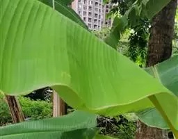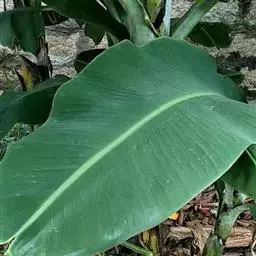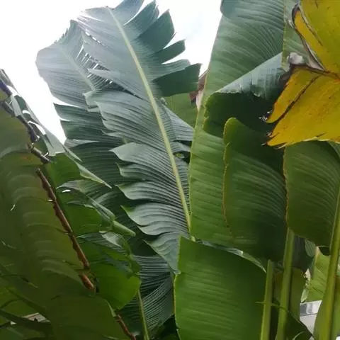 红蕉,假茎高1-2米。叶片长圆形,长1.8-2.2米,宽68-80厘米,叶面黄绿色,叶背淡黄绿色,…