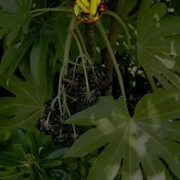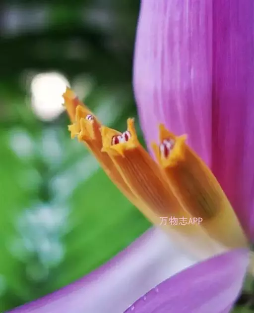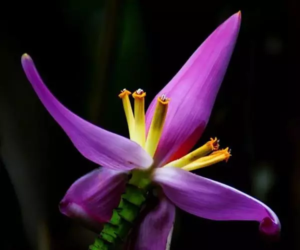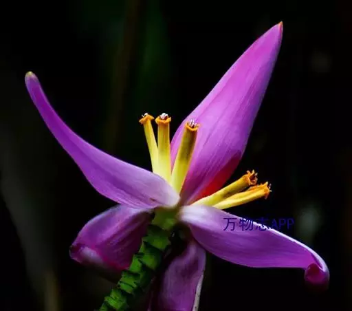 外形艳丽的是苞片,真正的花是躲于长圆形苞片的保 版纳热带花卉园中的紫苞芭蕉 护下,直到授粉才暴露出来的黄色小花。当下部的苞片向外反折时,可见到排成一行的雌花3—5朵,异化的萼片位于小香蕉状的子房上方。雄花也是3—5朵排成一行,但着生于顶端的苞片内,且晚些成熟,苞片叠瓦状或顶端微卷。果实状如指头,长6—8cm,种子黑色,但不可食。当果实成熟后,假茎会死亡凋零,新叶芽会从根茎处重新长出。