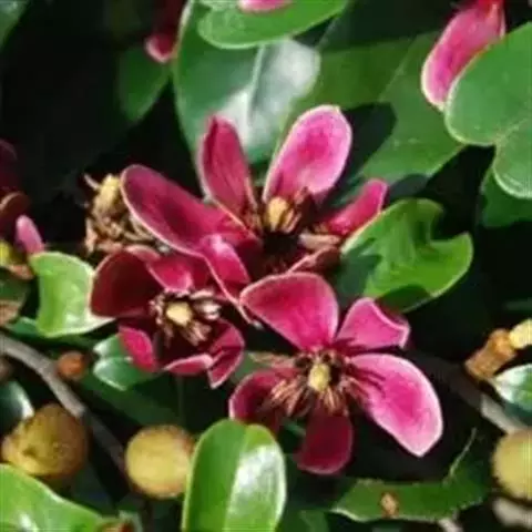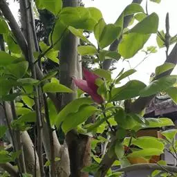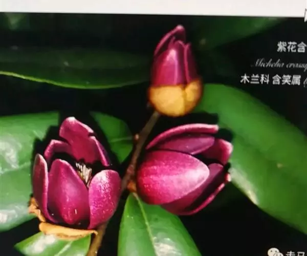 紫花含笑(Michelia crassipes Law),为木兰科木兰亚科,含笑属常绿小乔木或灌木,高2-5米,树皮灰褐色。四季有花开放,大量花期3-6月,花极芳香,有气味似酒或苹果的清香,使人心情极为舒畅。且花色为紫红色,更能增加人们的视觉效果,引起强烈的色感效应。聚合果长2.5-5厘米,骨突果扁卵球形或扁球形,被毛;果柄粗短,长1-2厘米,粗3-5毫米,果期为8-9月,抗干旱性极强,几乎无病虫害,对土壤要求不严。由于紫花含笑尤其是墨紫含笑色彩独特,芳香宜人,很受喜爱。