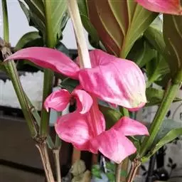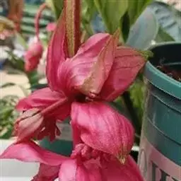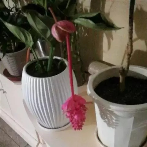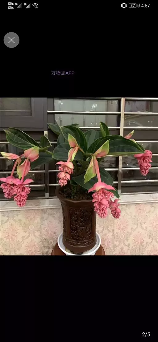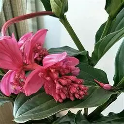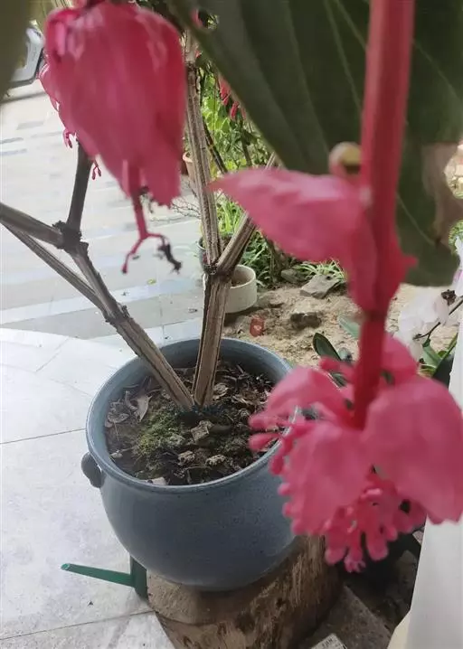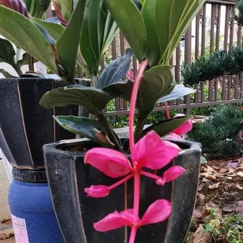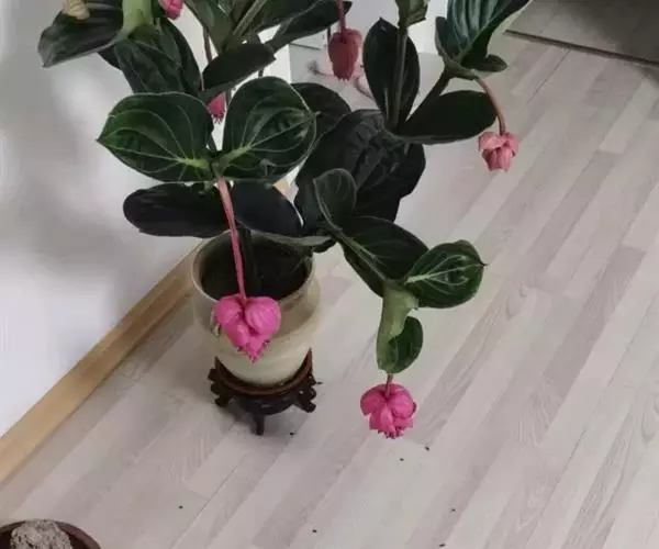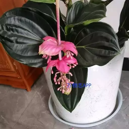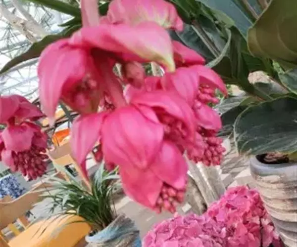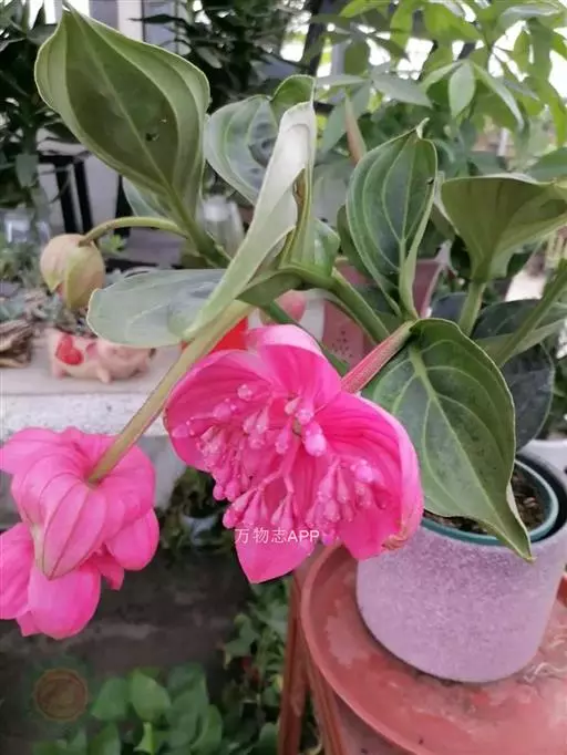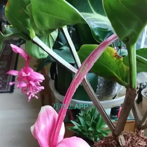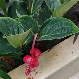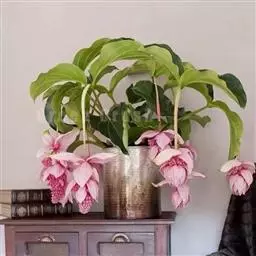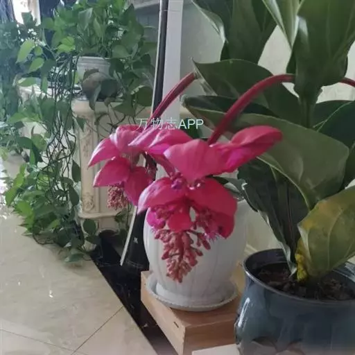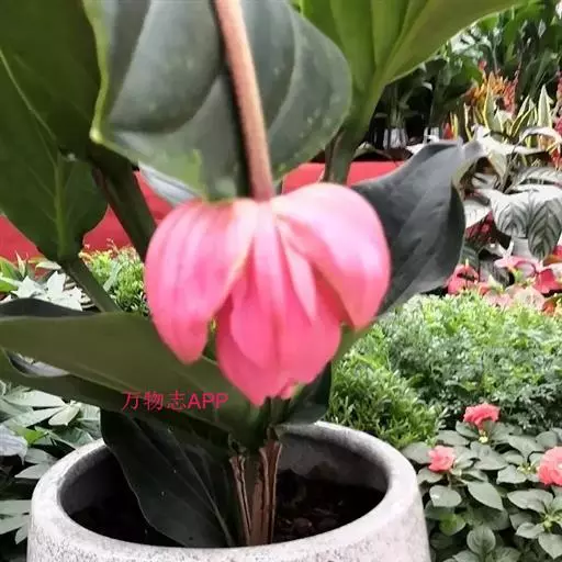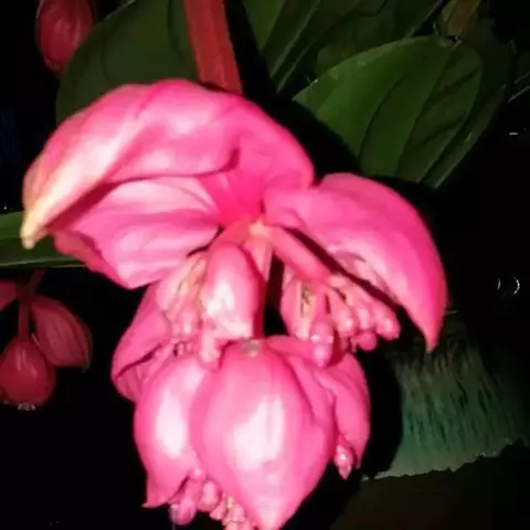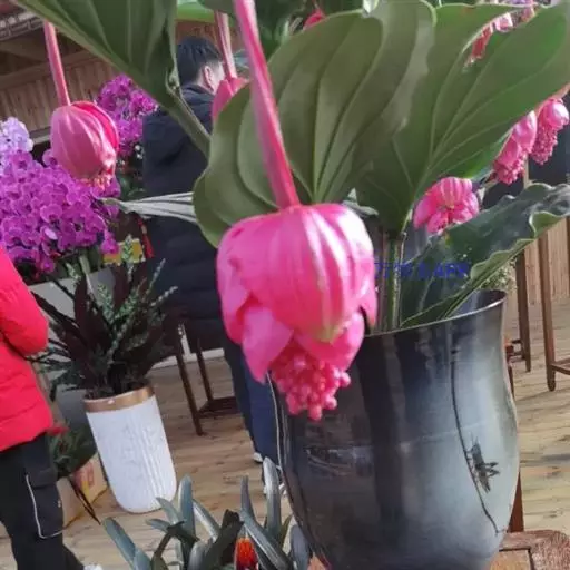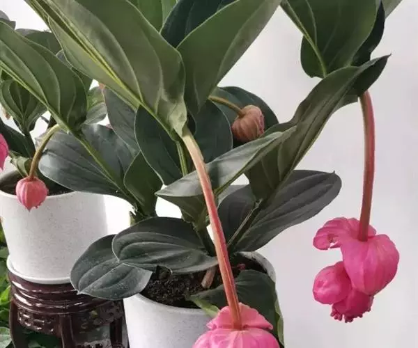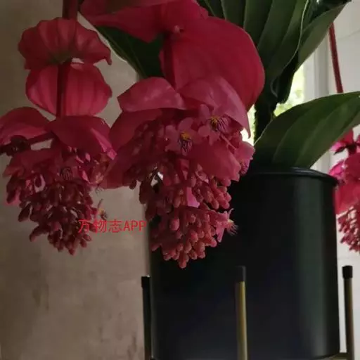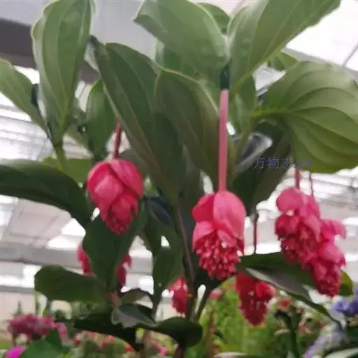 粉苞酸脚杆(学名:Medinilla magnifica Lindl. )是野牡丹科,酸脚杆属常绿小灌木,宝莲灯茎较短而粗壮,叶形类似柑橘,互生。植株多分枝,花茎从叶腋处抽出,硕大的花蕾类似倒挂的灯笼,开花时的花瓣类似倒开的荷花,花茎顶端和花瓣处挂满类似珍珠宝石的小球,故名宝莲灯花。花色有浅粉色和粉红色。花期为2月至8月,花开时间可长达百天以上。