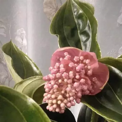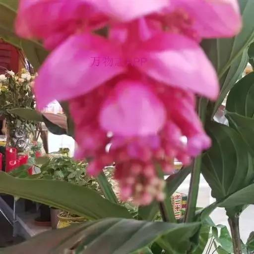 穗状花序下垂,似风铃,花蕾抽出后先露粉红色苞片,花序上绽出珍珠状粉色小圆花,长45厘米,花冠直径约0.25厘米,红色;子房下位,4-5室,萼片宿存,雄蕊等长,8-10个,花药顶具嚎,单孔开裂;花瓣4片,倒卵形至圆形;花外苞片长达3-10厘米,粉红色,别致可爱。