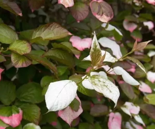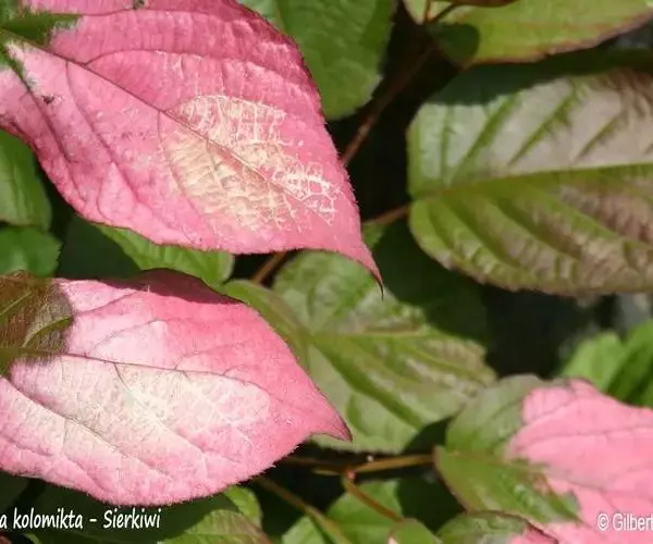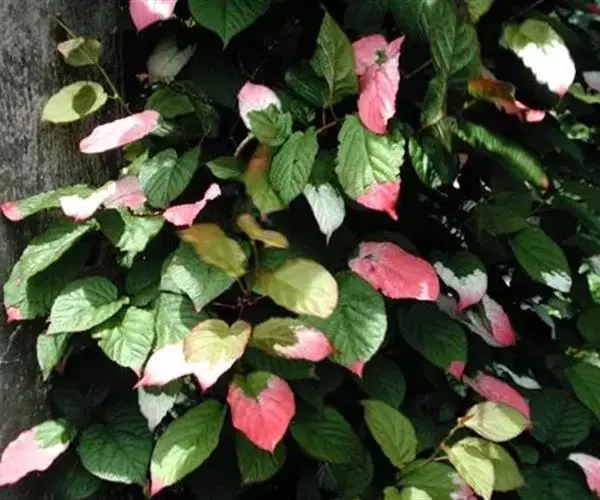 狗枣猕猴桃(学名:Actinidia kolomikta (Maxim. & Rupr.) Maxim.)是猕猴桃科、猕猴桃属大型落叶藤本;小枝紫褐色,短花枝基本无毛,隔年枝褐色,有光泽,叶膜质或薄纸质,阔卵形、长方卵形至长方倒卵形,边缘有锯齿,两面近同色,上部往往变为白色,后渐变为紫红色,腹面散生软弱的小刺毛,叶脉不发达,近扁平状,叶柄初时略被少量尘埃状柔毛,后秃净。聚伞花序,雄性的有花3朵,雌性的通常1花单生,花序柄和花柄纤弱,苞片钻形,花白色或粉红色,芳香,萼片长方卵形,两面被有极微弱的短绒毛,边缘有睫状毛;花瓣长方倒卵形,花丝丝状,花药黄色,长方箭头状,子房圆柱状,果柱状长圆形、卵形或球形,果皮洁净无毛,无斑点,未熟时暗绿色,成熟时淡桔红色,并有深色的纵纹;果熟时花萼脱落。5月下旬(四川)-7月初(东北)开花,9-10月果熟。