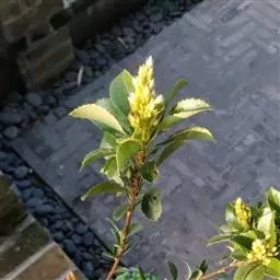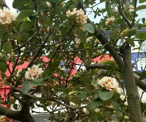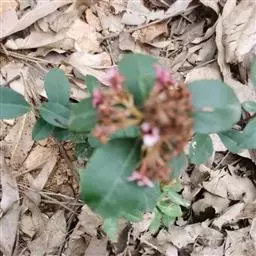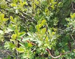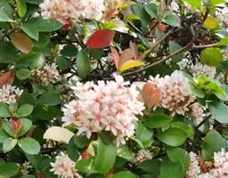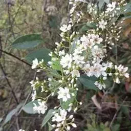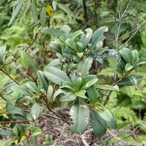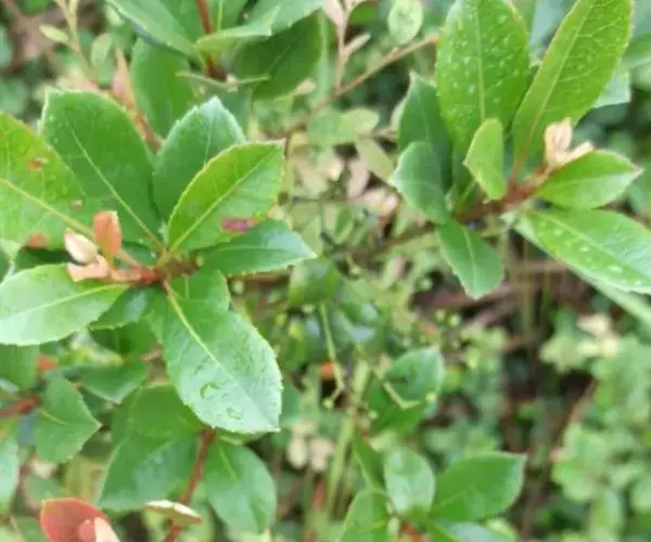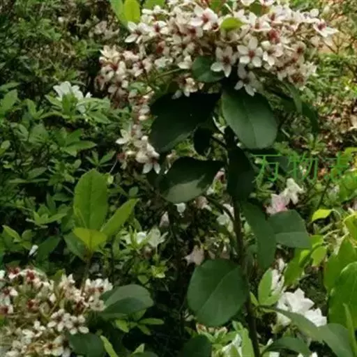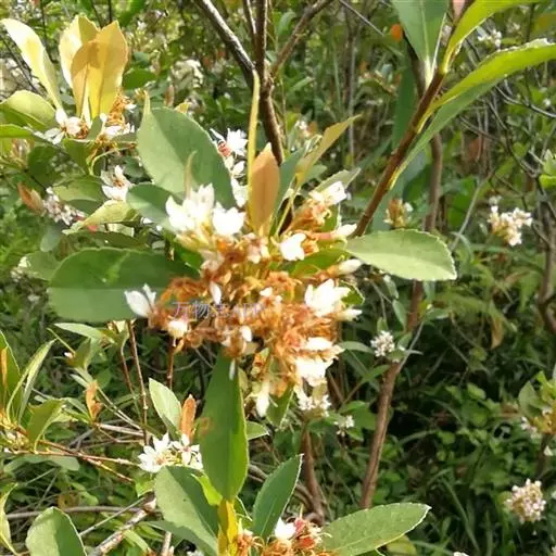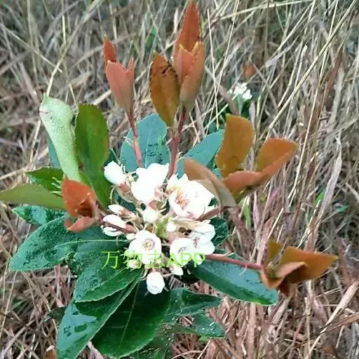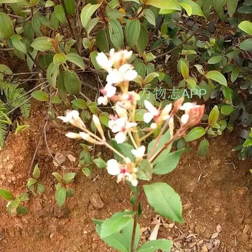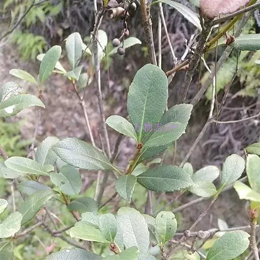 【植物形态】:植物形态:常绿灌木,高可达3米。树皮暗紫褐色或暗灰色,小枝紫棕色,光滑无毛。叶互生,革质,长椭圆或倒卵至倒卵状披针形,长约3.5~8厘米,宽1.5~3.5厘米,先端钝或短渐尖,基部楔形并下延于叶柄,表面暗绿色,背面淡绿色或苍白色,两面无毛,主脉于下面隆起,边缘向下卷,具疏锯齿。花白色带红晕,顶生总状花序或短圆锥花序,花萼5裂,花冠5瓣,雄蕊15枚左右,子房下位,2室。果为梨果状,球形,熟时蓝黑色。