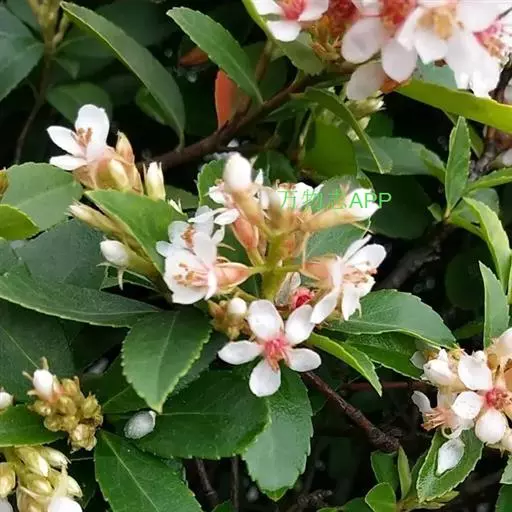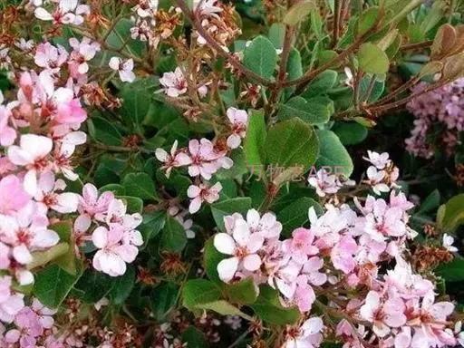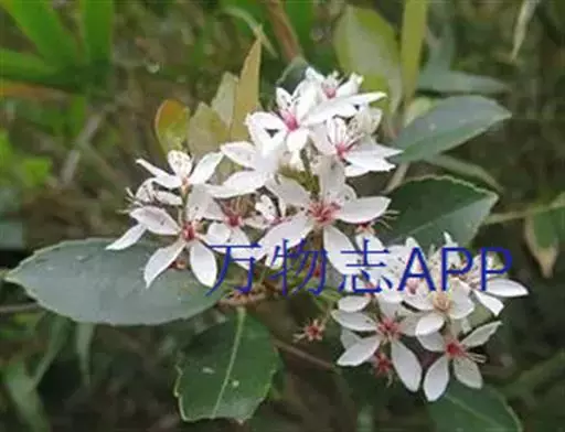 Raphiolepisindica,蔷薇科石斑木属常绿灌木或小乔木。染色体数2n=2x=34。高4m,树冠近球形。单叶互生,卵形或长圆形,长2~8cm,多集生枝端,先端渐尖、急尖或圆钝形;顶生圆锥花序,花瓣白色或淡红色,花径1.0~1.3cm,花期4月;梨果球形,...