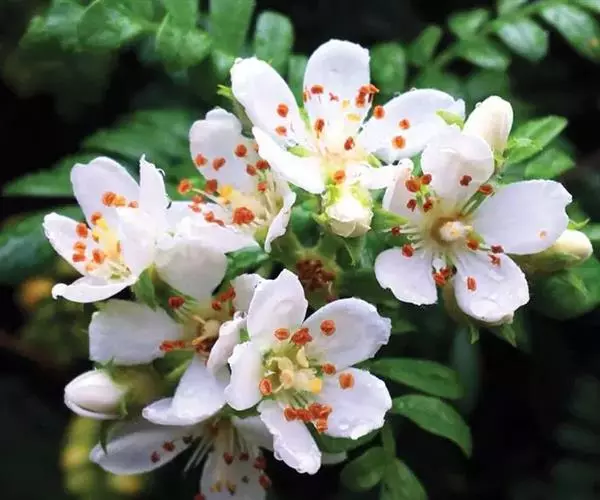 常绿灌木,稀小乔木,高可达4米;幼枝初被褐色绒毛,以后逐渐脱落近于无毛。叶片集生于枝顶,卵形、长圆形,稀倒卵形或长圆披针形,长 (2-) 4-8厘米,宽1.5-4厘米,先端圆钝,急尖、渐尖或长尾尖,基部渐狭连于叶柄,边缘具细钝锯齿,上面光亮,平滑无毛,网脉不显明或显明下陷,下面色淡,无毛或被稀疏绒毛,叶脉稍凸起,网脉明显;叶柄长5-18毫米,近于无毛;托叶钻形,长3-4毫米,脱落。顶生圆锥花序或总状花序,总花梗和花梗被锈色绒毛,花梗长5-15毫米;苞片及小苞片狭披针形,长2-7毫米,近无毛;花直径1-1.3厘米;萼筒筒状,长4-5毫米,边缘及内外面有褐色绒毛,或无毛;萼片5,三角披针形至线形,长4.5-6毫米,先端急尖,两面被疏绒毛或无毛;花瓣5,白色或淡红色,倒卵形或披针形,长5-7毫米,宽4-5毫米,先端圆钝,基部具柔毛;雄蕊15,与花瓣等长或稍长;花柱2-3,基部合生,近无毛。果实球形,紫黑色,直径约5毫米,果梗短粗,长5-10毫米。花期4月,果期7-8月。 [1-2]