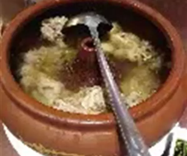 汽锅鸡 蒸汽锅鸡的餐具要用建水的土陶汽锅味道才正。建水汽锅外形古朴,构造独特,肚膛扁圆,正中立有一根空心管,蒸汽沿此管进入锅膛,经过汽锅盖冷却后变成水滴入锅内,成为鸡汤。两三个小时后,肉粑骨离,便可食用,鸡块鲜嫩,汤汁甜美。