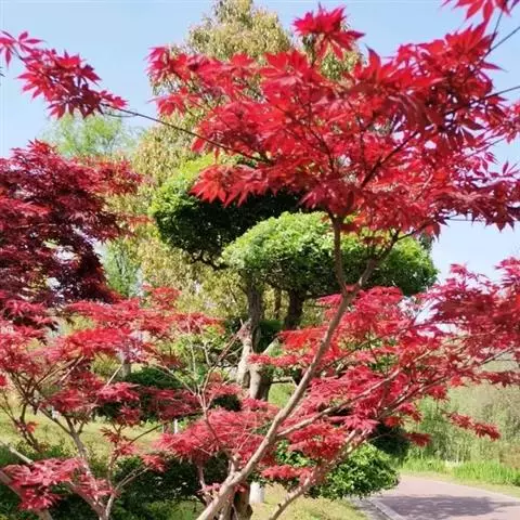红枫,园艺种,槭树科槭属落叶小乔木,高5~8 m;树冠伞形,枝条开张,细弱。单叶对生,近圆形,薄纸质,…
