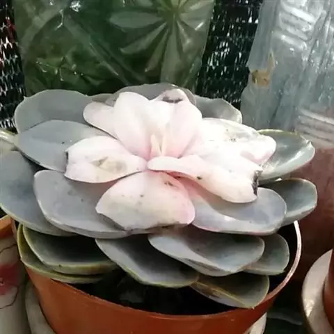 蓝石莲是景天科、拟石莲花属的多肉植物。茎部粗壮,成熟植株茎部木质化。叶片莲座型密集排列,株径不会很大,…