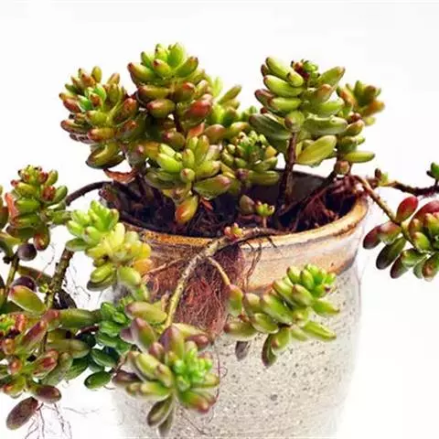 玉米石是景天科、景天属植物。多年生草本多浆植物。植株低矮丛生,多分枝。叶膨大成圆筒形、卵形或近小球形,…