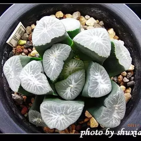 叶子表面宽厚,富肉质感且带有磨纱质感,看像石头质地;开红色小花,生于植株顶部,倒伞形密生,形状像花…
