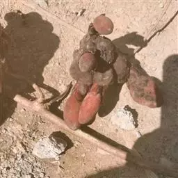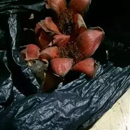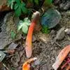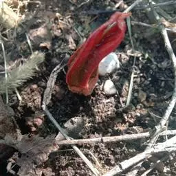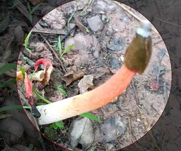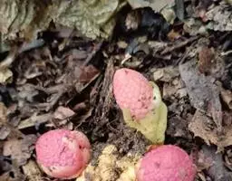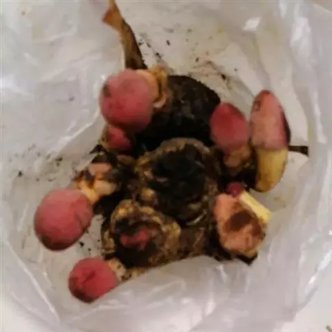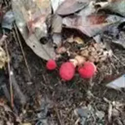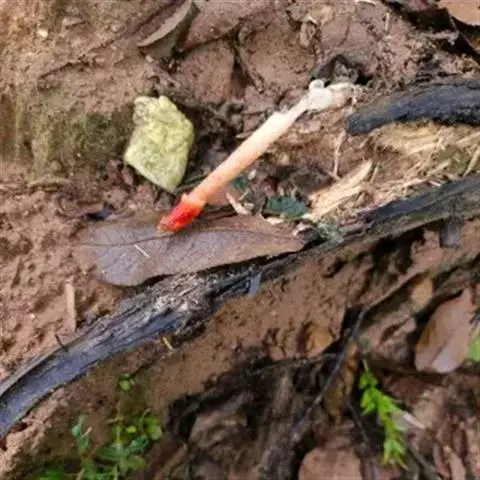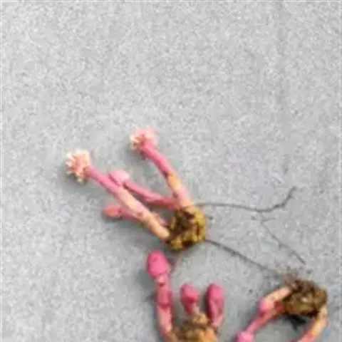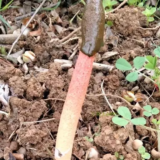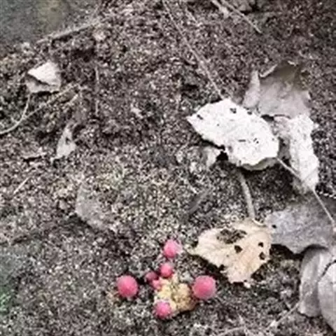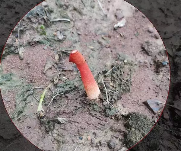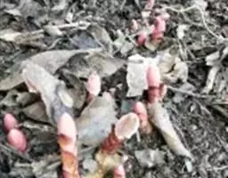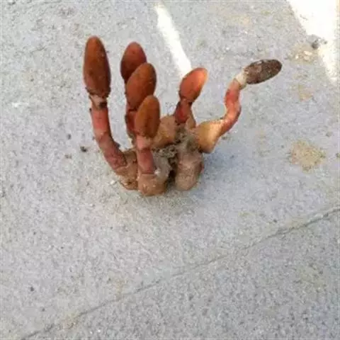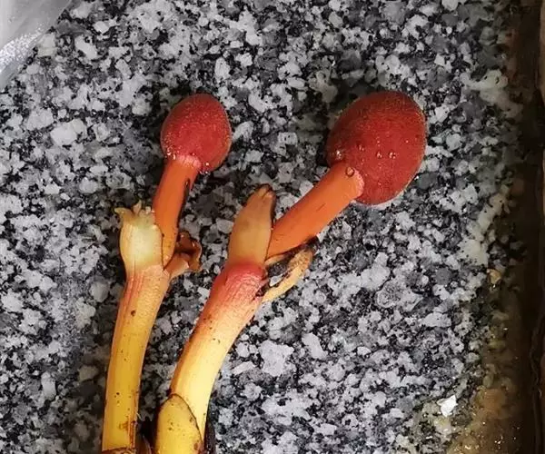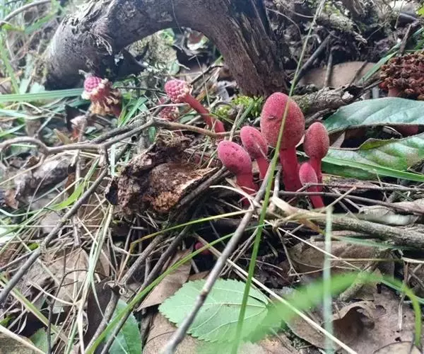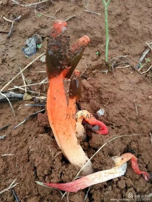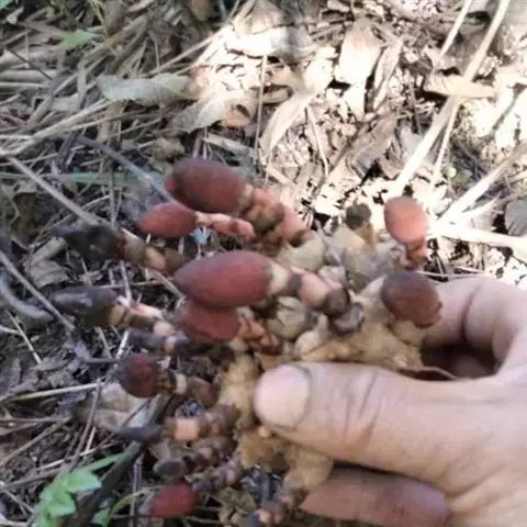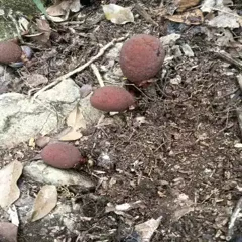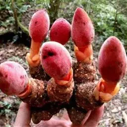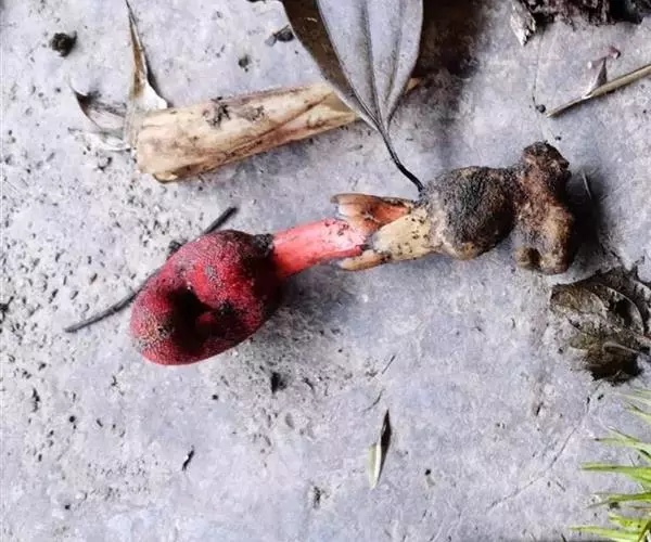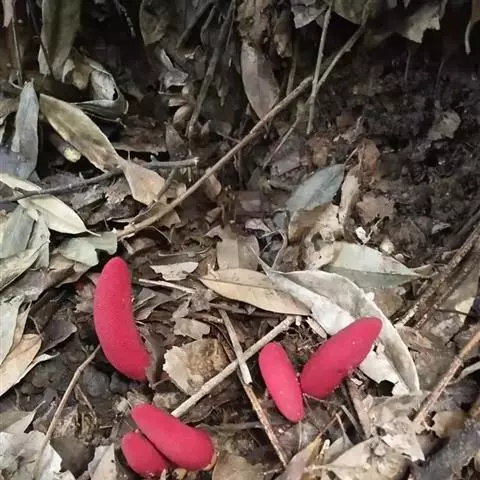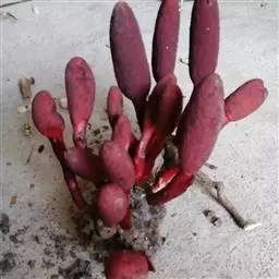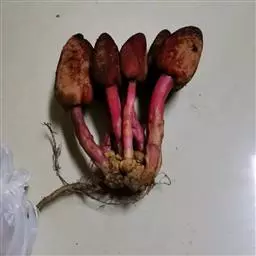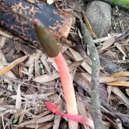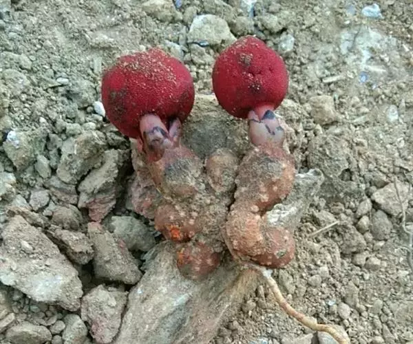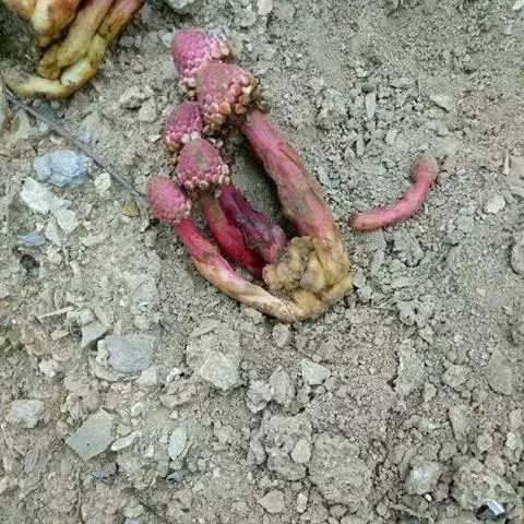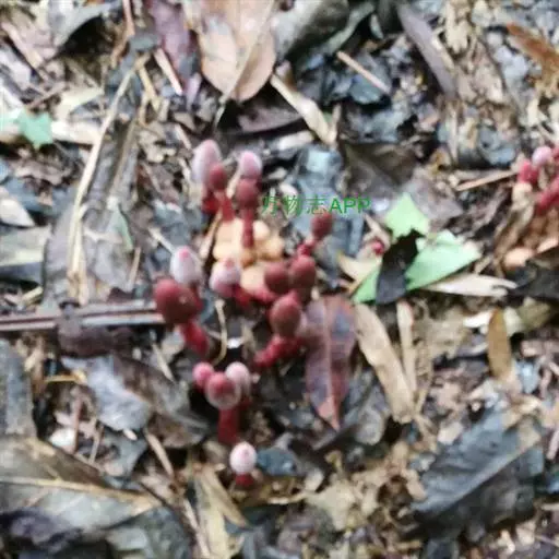 草本,高10-20厘米,全株鲜红色至暗红色,有时转紫红色;根茎分枝,分枝近球形,长1-3厘米,宽1-2.5厘米,表面密被粗糙小斑点和明显淡黄白色星芒状皮孔;花茎长5-10厘米;鳞苞片椭圆状长圆形,顶端钝,互生,8-14枚,长2-2.5厘米,宽1-1.5厘米,基部几全包着花茎。花雌雄异株(序);雄花序圆柱状,长3-18厘米,宽0.5-2厘米,顶端渐尖;雄花近辐射对称,疏生于雄花序上,花被裂片通常5(有时4或6),近圆形,长2-3毫米,顶端尖或稍钝圆;聚药雄蕊近圆盘状,有时向两侧稍延展,中部呈脐状突起,直径4.5-6毫米,花药5枚,小药室10;无梗或近无梗;雌花序卵圆形至长圆状椭圆形,向顶端渐尖,长2-6厘米,宽0.8-2厘米;子房卵圆形,宽约0.5毫米,具细长的花柱和具短子房柄,聚生于附属体的基部附近;附属体棍棒状或倒圆锥尖状,顶端截平或顶端中部稍隆起,中部以下骤狭呈针尖状,长约1毫米。花期9-11月。