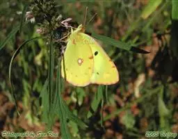 纹黄蝶,翅面黄色,缘毛桃红色;前翅外缘宽的黑边中有几个黄色斑,中室端部有一个黑斑;后翅外缘的黑色斑…