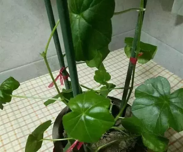 多年生攀缘或缠绕草本,长40-100厘米。茎粗3-10毫米,具棱角,多分枝,光滑或几无毛。叶互生,略呈肉质;托叶大,三角状心形,叶柄插生于叶缘以内;叶片近圆形,直径5-7厘米,五角状浅裂或有时近全缘,裂片宽三角形,先端微钝,边缘被睫毛。伞房花序腋生,有花数朵,总花梗和花梗被柔毛;花梗长6-10毫米,被柔毛,位于萼距之下;萼片披针形,长约1厘米,光滑或略被长柔毛;花冠洋红色,上面2瓣着深色条纹(栽培的种类其花瓣通常为同一颜色),下面3瓣彼此分离。 [1-2]