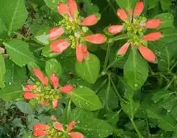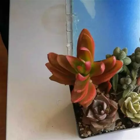 叶子表面宽厚,富肉质感且带有磨纱质感,看像石头质地;开红色小花,生于植株顶部,倒伞形密生,形状像花…