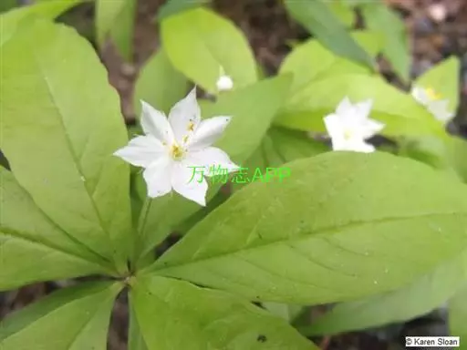 根茎纤细,横走,末端常膨大成块状,具多数纤维状须根。茎直立,高 5-25厘米。叶5-10枚聚生茎端呈轮生状,叶片披针形至倒卵状椭圆形,长2-7厘米,宽1-2.5厘米,先端锐尖或稍钝,基部楔形至阔楔形,具短柄或近于无柄,边缘全缘或具不明显的微细圆齿;茎下部叶极稀疏,通常仅1-3枚,甚小,长3-7毫米,宽1-2毫米,或呈鳞片状。花1-3朵,单生于茎端叶腋;花梗纤细,长2-4厘米;花萼分裂近达基部,裂片线状披针形,长4-7毫米;花冠白色,比花萼约长1倍,裂片椭圆状披针形,先端锐尖或具骤尖头;雄蕊比花冠稍短,长4-5毫米;子房球形,花柱约与雄蕊等长。蒴果直径2.5-3毫米,比宿存花萼短。花期5-6月;果期7月。 [1-2]
