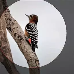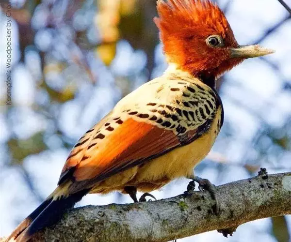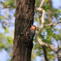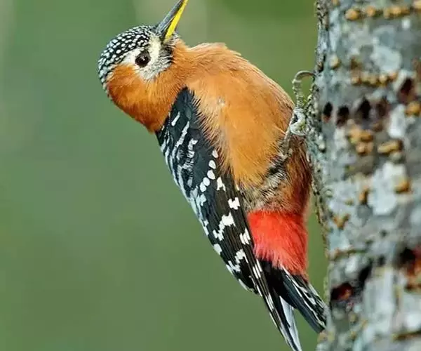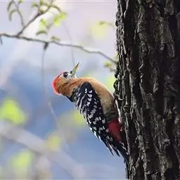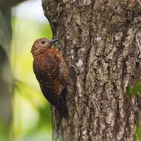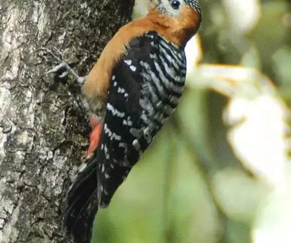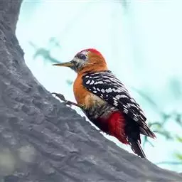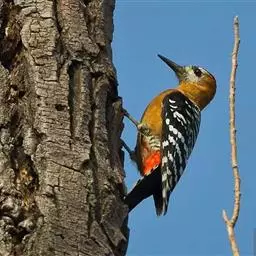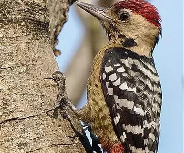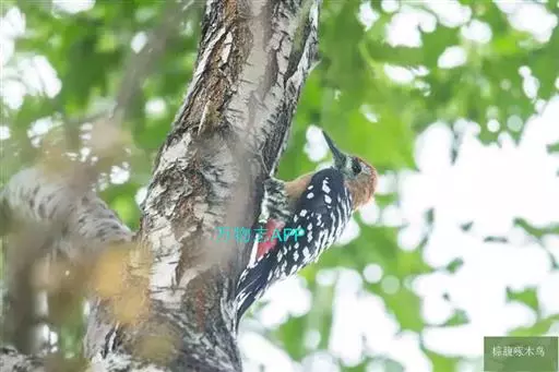 棕腹啄木鸟(学名:Dendrocopos hyperythrus)是中等体型的鸟类,体长约20厘米。头顶部具红色斑带。脚强健,有趾4个,其中2个向前,2个向后,各趾的趾端均具有锐利的爪,巧于攀登树木。尾羽的羽干刚硬如棘,能以其尖端撑在树干上,助脚支持体重并攀木。嘴强直如凿。舌细长,能伸缩自如,先端并列生短钩。攀木觅食时以嘴叩树。头骨十分坚固,大脑周围有一层绵状骨骼,内含液体,对外力能起缓冲和消震作用;能把喙尖和头部始终保持在一条直线上。錾树洞营巢,吃食昆虫,对防治林木害虫起到重要的作用,被称为“森林医生”