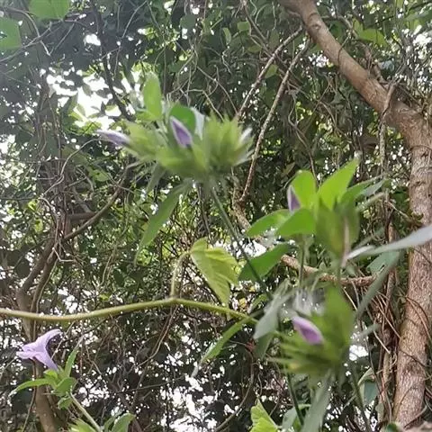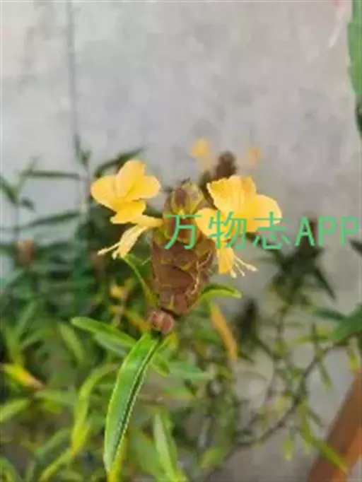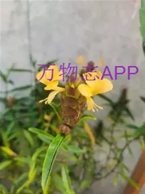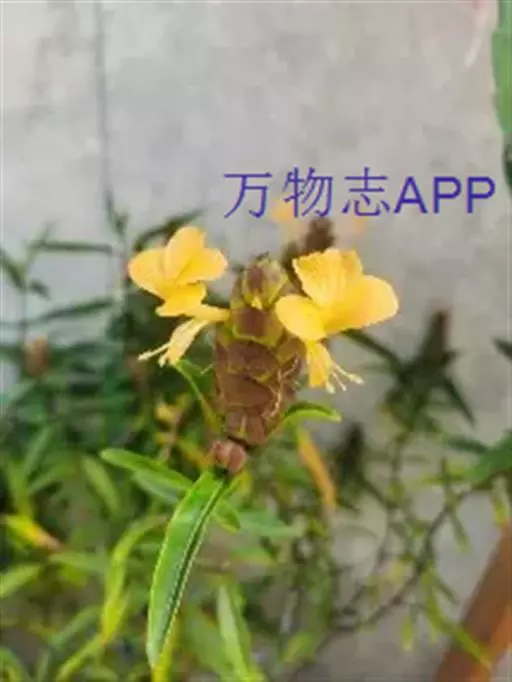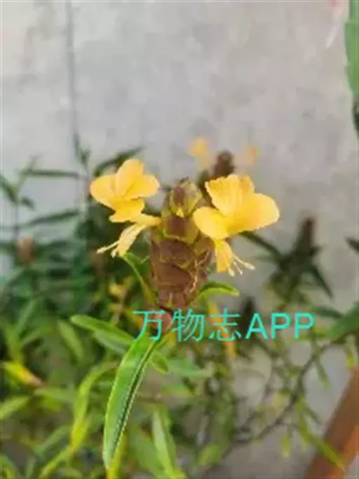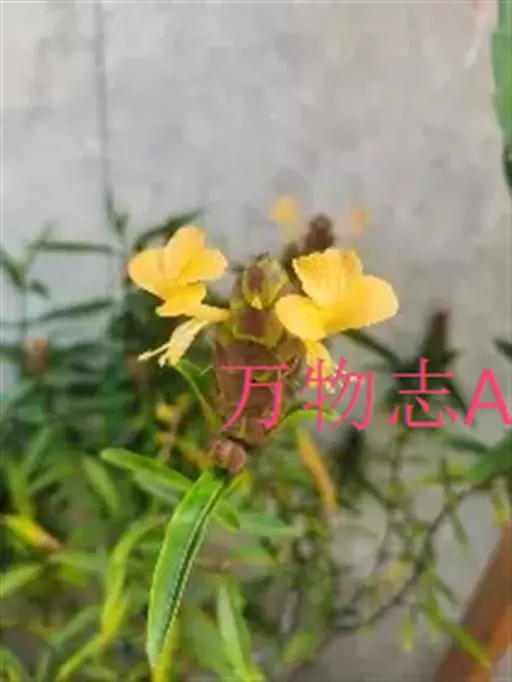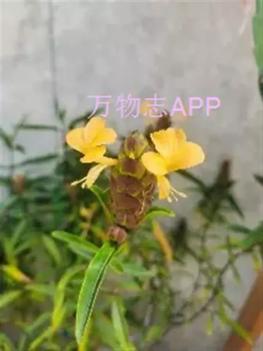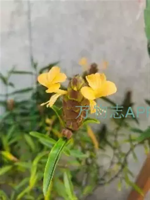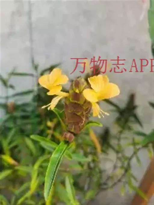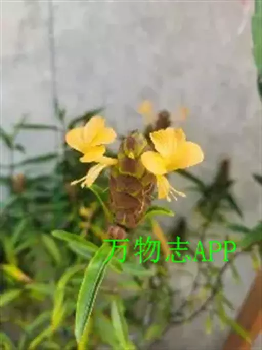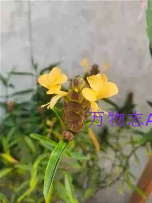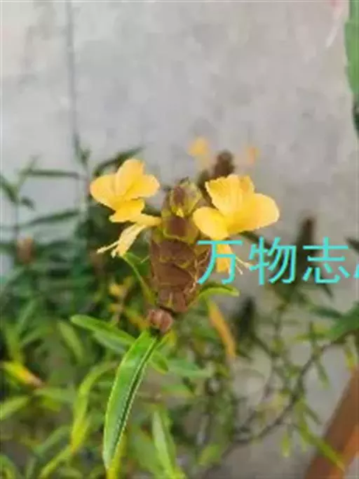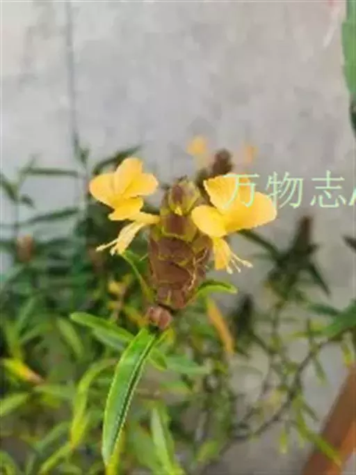 花密集着生于短枝上的苞腋,花序穗状;长枝及短枝基部的苞片为缩小的叶状,腋内着生1朵花,小苞片变成叉开的硬刺,向上逐渐变狭,苞片线状,长约10毫米,不再成刺;在正常叶腋着生的花的小苞片也变为叉开的硬刺,花果脱落后仍宿存;大花萼裂片卵形,先端渐尖,具软骨质尖刺,长14毫米,内面的略短,长13毫米,小萼狭卵形,长13毫米,先端渐尖;花冠黄色,长约2.4厘米,花冠管略短于喉部,下唇中裂片略宽而短,长8毫米,宽7毫米,两侧裂片与上唇裂近相等,长10毫米,宽6毫米;大雄蕊花药长3.2毫米,花丝长11毫米,小雄蕊花药长约1毫米,花丝长1.5毫米,均着生于喉基部;子房卵形,花柱线状,柱头略膨大,稍2裂,外露。蒴果卵形,长18毫米,径2.5毫米,先端渐尖成一实心的喙,内有种子2。