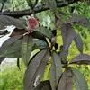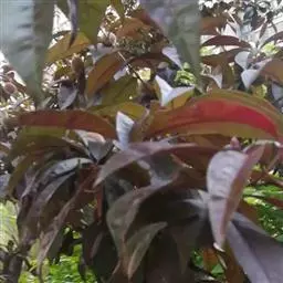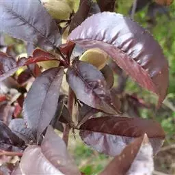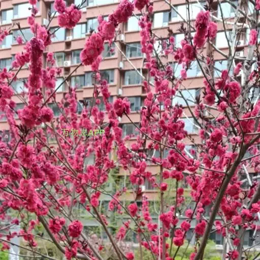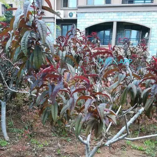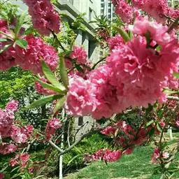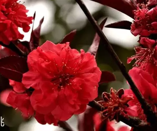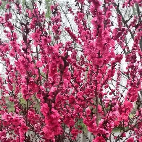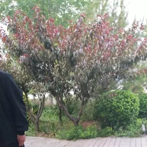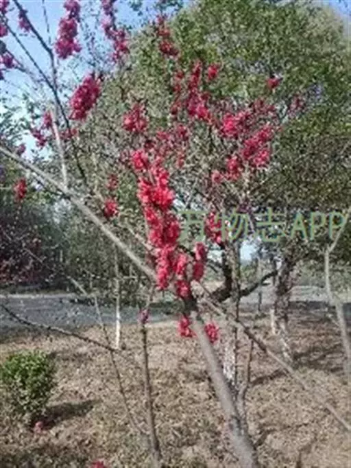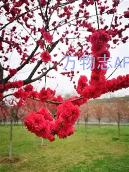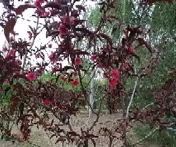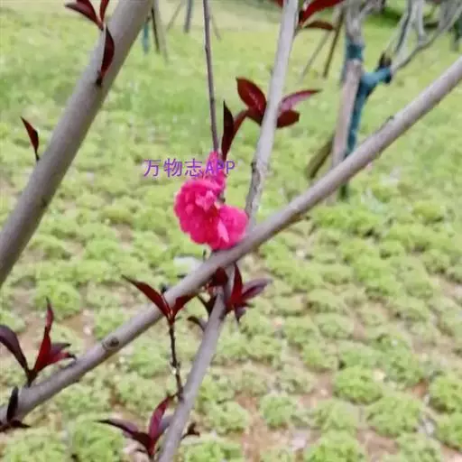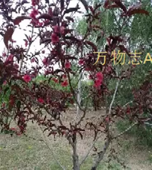红叶碧桃株高3—5米,树皮灰褐色,小枝红褐色。单叶互生,卵圆状披针形,幼叶鲜红色。花重瓣、桃红 色。核果球形,果皮有短茸毛,内有蜜汁。三月份先花后叶,烂漫芳菲,妩媚可爱,是优良的观花树种。
