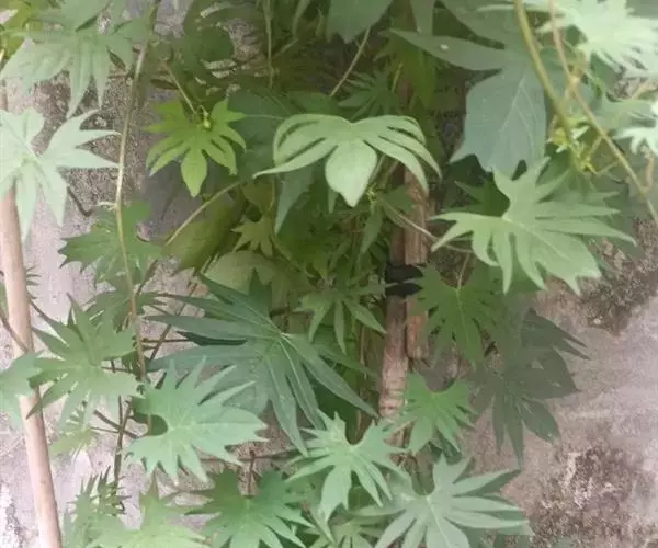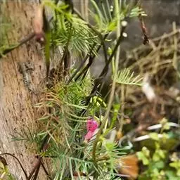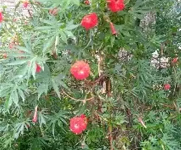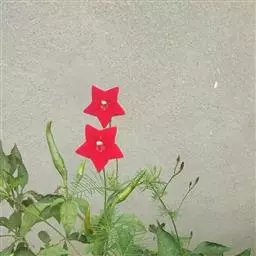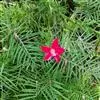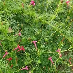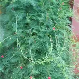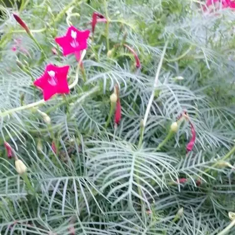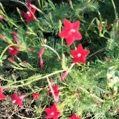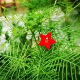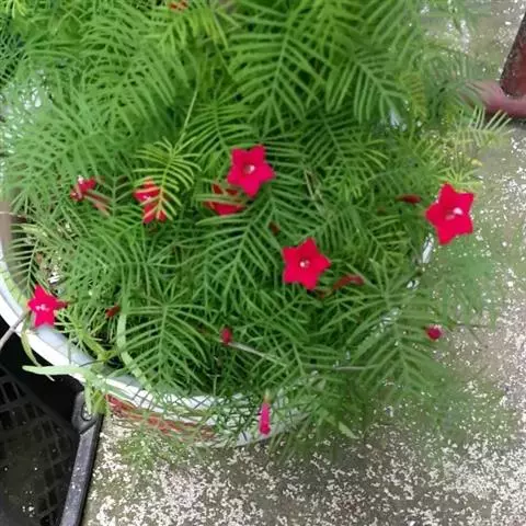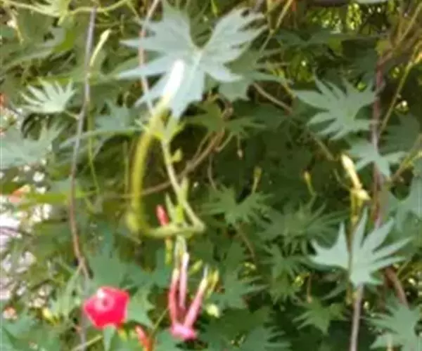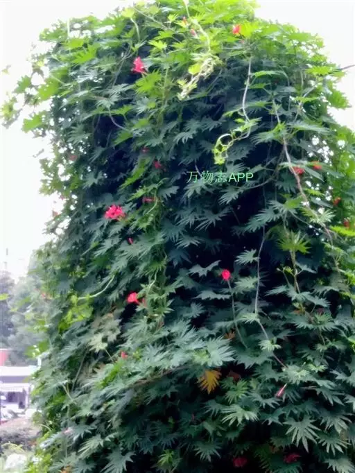葵叶茑萝,为一年生缠绕草本。单叶互生,羽状深裂,裂片线形,细长如丝。聚伞花序腋生,着花数朵,花从叶腋下生出,花梗长约寸余,上着数朵五角星状小花,花高脚碟状,鲜红色或白色,花冠五浅裂,花冠边平展,花瓣五裂,整个花形远看似五角星,花冠红色,有白色及粉红色变种。