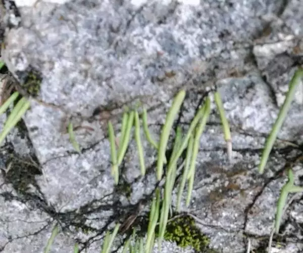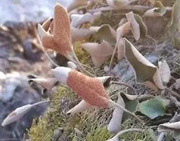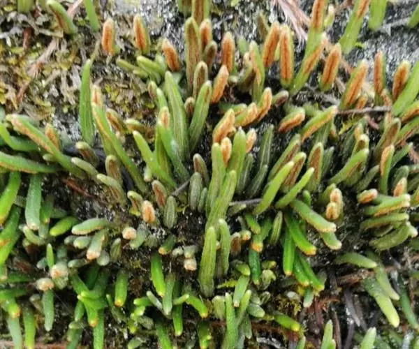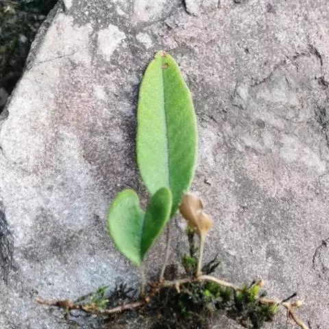 石附生小型蕨类,高10-12厘米。根状茎细长横走,密被鳞片;鳞片卵状披针形,长渐尖头,边缘具细齿,红棕色至淡棕色,盾状着生。叶远生,相距1-2厘米,几无柄,基部以关节着生;叶片线形,长3-9厘米,宽2-3.5厘米,钝尖头,基部渐狭缩,干后革质,边缘向下强烈反卷,幼时上面疏生星状毛,下面密被黄色星状毛,宿存。主脉明显,上面凹陷,下面隆起,小脉网状,沿主脉两侧各构成一行长网眼,无内藏小脉,近叶边的细脉分离,先端有一膨大的水囊。孢子囊群线形,沿主脉两侧各成一行,位于主脉与叶缘之间,幼时全被反卷的叶边覆盖,成熟时张开,孢子囊外露;孢子椭圆形,单裂缝,周壁上面具有分散的小瘤,外壁光滑。