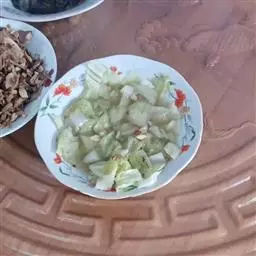 6、把沥干水的食材放入冰水中,保持食材脆爽(冰箱里常备一瓶冰水,做拌菜可以保持脆爽,另外,如在厨房溅到油、烫烧什么,可以马上敷下)。
