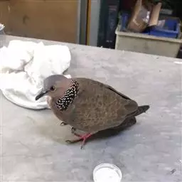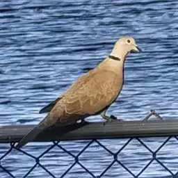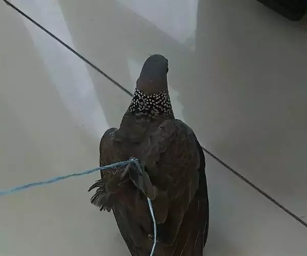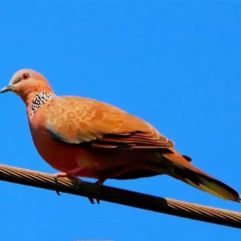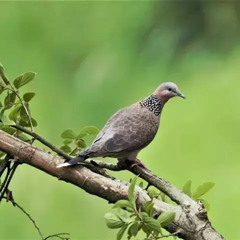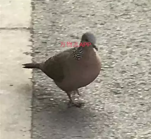 珠颈斑鸠(Streptopelia chinensis)是中国东部和南部最为常见的野生鸽形目鸟类,俗称“野鸽子”。体长30厘米左右,和鸽子大小相似。通体褐色,颈部至腹部略沾粉色。最引人注意的是它的颈部两侧为黑色,密布白色点斑,像许许多多的“珍珠”散落在颈部,为本种最为显著的特征,因而得名“珠颈”斑鸠。 不过这个珍珠斑点只有成年的珠颈斑鸠才有,幼鸟是没有的(此外,印度还有一个亚种也是没有“珍珠”的),且幼鸟的颜色也没有成鸟那样鲜艳。