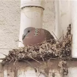 通常由雄鸟寻找合适的地方,再带雌鸟去选,选一个双方都认为可以的地方,筑巢是一起筑的;但也可能“鹊巢鸠占”,占用之前其他珠颈斑鸠或其他鸟类的巢。营巢于小树枝杈上或在矮树丛和灌木丛间营巢,也见在山边岩石缝隙中营巢的。巢呈平盘状,甚为简陋,主要由一些细枝堆叠而成,结构甚为松散。
