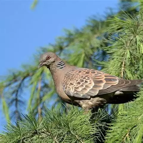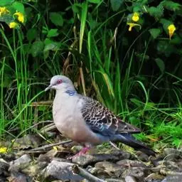 山斑鸠,是鸽形目鸽鸠科斑鸠属鸟类,又名金背斑鸠、棕背斑鸠、山鸠、金背鸠、麒麟斑、麒麟鸠、东方斑鸠、绿斑鸠、山鸽子。山斑鸠颈侧具明显黑白色条纹的块状斑,上体深褐色、具扇贝状斑纹,羽缘棕色,尾羽近黑色,下体多偏粉色。虹膜黄色,喙灰色,脚粉色。山斑鸠是留鸟,在中国常见且分布广泛。此外,还分布于不丹、尼泊尔、巴基斯坦、印度、日本等国。栖息于针阔混交林、季风常绿阔叶林、果园及农耕区,多成对活动于开阔农耕区、村舍、寺院周围及防火林带。取食于地面,主要觅食植物种子、果实、嫩芽等,也吃昆虫。山斑鸠飞翔时鼓翼快速,叫声为反复而低沉的“咕咕咕”声。繁殖期在4-7月,营巢于林中树上,通常一年繁殖2窝,窝卵数2枚,由雌雄亲鸟轮流孵卵,孵化期18~19天。山斑鸠的肉、卵可食,肉入药可益气明目、强筋壮骨,治久病气虚、衰弱无力、两目昏暗等病症。山斑鸠啄食杂草种子,对农田清除杂草有益;但有时也刨食农作物及树的种子。山斑鸠