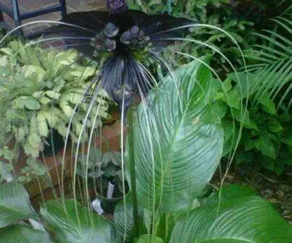 箭根薯,又名大叶屈头鸡《广西植物名录》,老虎花《中国高等植物图鉴》。多年生草本。根茎块状,环节明显,须根多数。叶基生,具长柄,柄长10-30cm,基部扩展成鞘状抱茎,肉质;叶片长椭圆形,长20-50cm,宽7-14cm,先端渐尖,基部楔形,下延,全缘,上面绿色,下面浅绿色,两面无毛;主脉粗壮向下突出,侧脉羽状平行。花葶从叶丛中抽出;总苞片4,暗紫色;数朵花簇生,排列成伞形花序状,常下垂;苞片线形,长约10cm;花被裂片6,紫褐色,内轮裂片较宽,先端具小尖头;雄蕊6,花丝顶部兜状,柱头弯曲成伞形,3裂,每裂片又2浅裂。浆果肉质,椭圆形,具6棱,成熟后紫褐色;种子肾形,长约3mm。花果期4-11月。