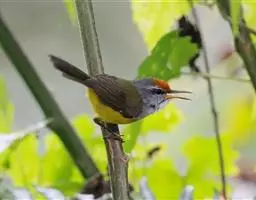 金头伪缝叶莺:体长10-12厘米,是一种体型小的棕顶冠、黄色腹森林莺类。头顶亮黄色,具明显的黄色眉…