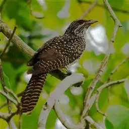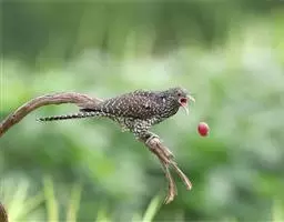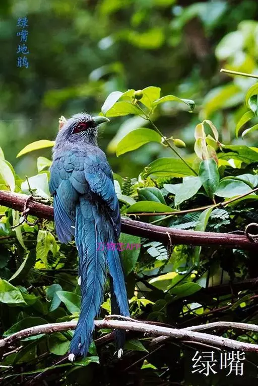 绿嘴地鹃:体形似小鸦鹃,但羽色大致绿灰;嘴绿色,头侧眼的周围有一裸区;后爪弯曲。虹膜赤红色,…