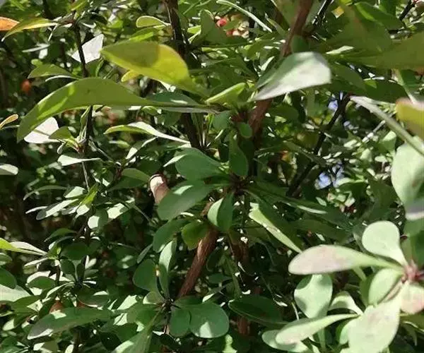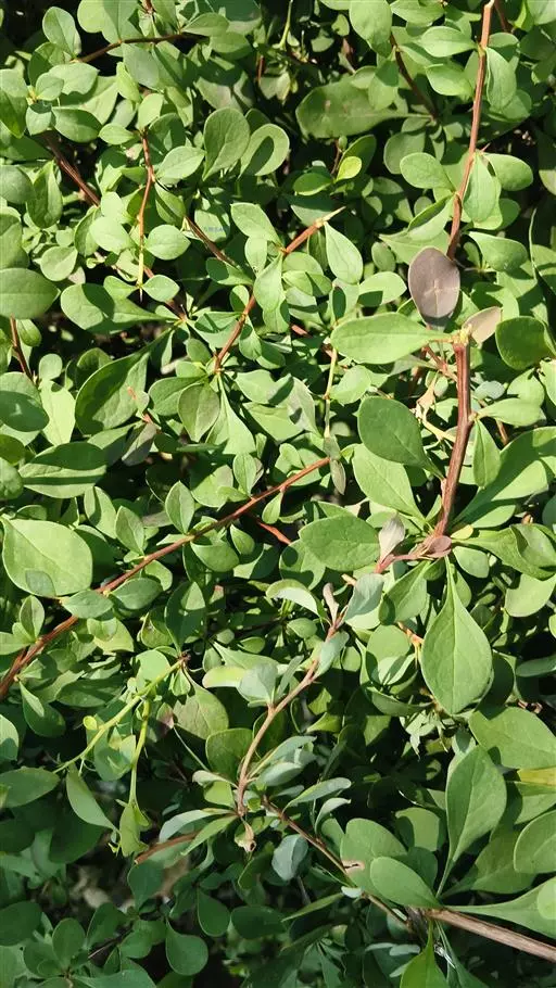 落叶灌木,一般高约1米,多分枝。枝条开展,具细条棱,幼枝淡红带绿色,无毛,老枝暗红色;茎刺单一,偶3分叉,长5-15毫米;节间长1-1.5厘米。叶薄纸质,倒卵形、匙形或菱状卵形,长1-2厘米,宽5-12毫米,先端骤尖或钝圆,基部狭而呈楔形,全缘,上面绿色,背面灰绿色,中脉微隆起,两面网脉不显,无毛;叶柄长2-8毫米。