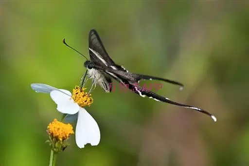 头宽、胸粗、腹部不长于胸部。前翅直角形。后缘较外缘短,亚基部有一透明白带与后翅中区透明带(白色)相连;后翅窄而长,折叠成一个很长的尾,其端缘呈白色。雄和雌相似,仅雌在腹部腹面尾端前有一大的交配槽。分布区普遍,多发生在开阔林区接近有水的地方。常近地面急速飞翔,看起来似蜻蜓活动。喝水过多时.会从肛门有节奏地喷出水来。也常访花,但不停息其上.只是前翅急速振动而尾部抖动抬高.靠近花处原地停飞。 翅展:44—50mm。