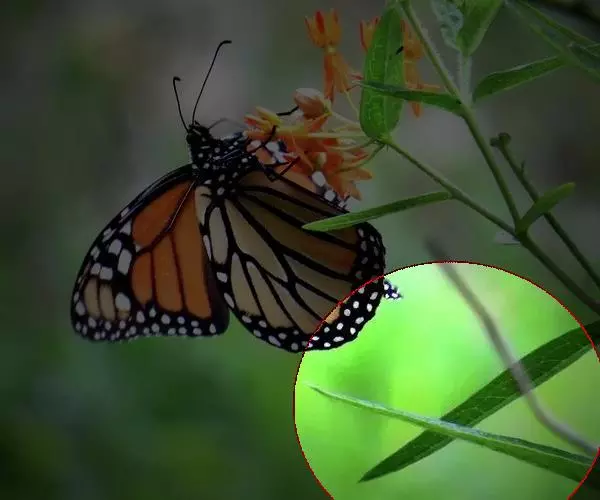 早期幼虫的胸部面是呈黑色的,胸部较窄,尾巴较宽。幼虫光滑。两则、头部的幼环及肛门部份都是黄赭色的。开始时头部是黑色的,在较后的时期会变为苹果绿色,背部较深,在第7至10节有3条幼长的黄带,在脚上由头至尾有一条浅黄色线。头部是绿色的,在顶部有四个黑圆点,和在口颌部份有两个较小的黑圆点。