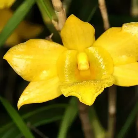 刀叶石斛(学名:Dendrobium terminale Par. et Rchb. f.):茎近木质,直立,有时上部分枝,扁三棱形,具多个节。叶二列,疏松套叠,厚革质或肉质,斜立,两侧压扁呈短剑状或匕首状;总状花序顶生或侧生;花序柄很短,常具1-3朵花,基部具数枚膜质鞘;花小,淡黄白色;花瓣狭长圆形,长3-4毫米,宽约1毫米,先端近钝,具1条脉;唇瓣贴生于蕊柱足末端,近匙形。花期9-11月。