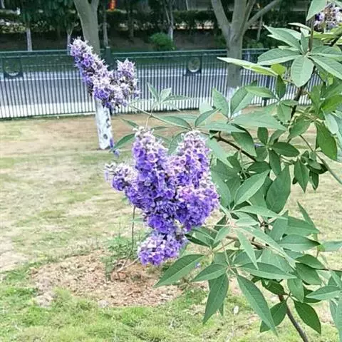 落叶灌木或小乔木,高可达2-8米,地径7-8厘米,树皮灰褐色,幼枝方形有四棱,老枝圆柱形,灰白色,被柔毛;掌状复叶对生或轮生,小叶5或3片,中间小叶最大且有明显短柄,两侧较小,长2-6厘米,叶缘呈大锯齿状或羽状深裂,上面深绿色具细毛,下面灰白色,密被柔毛。花序顶生或腋生,先由聚伞花序集成圆锥花序,长10-25厘米,花冠紫色或淡紫色,萼片宿存形成果苞,核果球形,果径2-5毫米,黑褐色,外被宿萼。花期6-8月,果期9-10月。