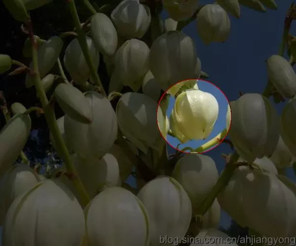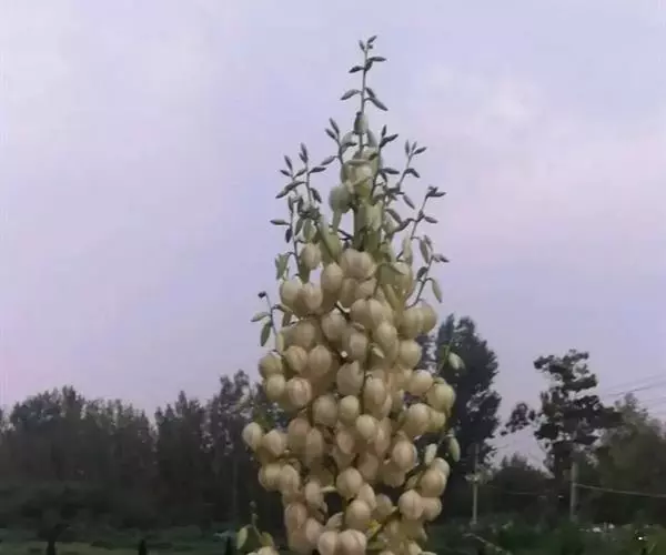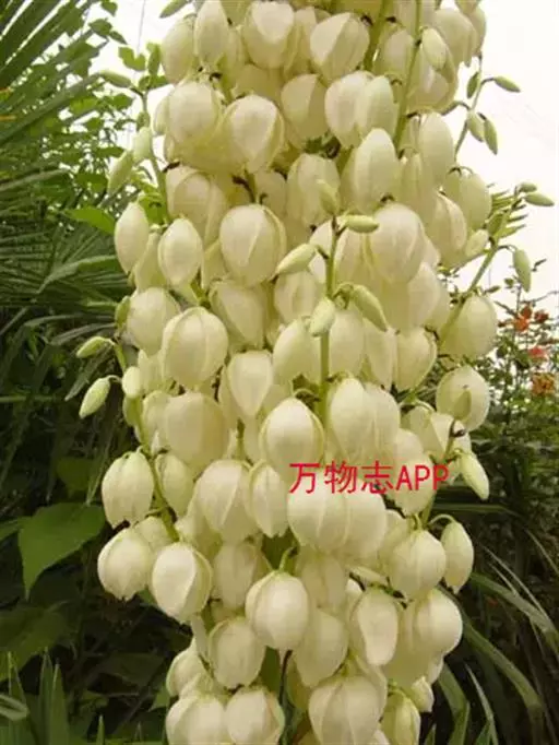 花莛高1米~2米,大型圆锥花序,有花多朵;花白色至乳黄色,顶端常带紫红色,下垂,钟形,花被 6片,卵状菱形;花期7月~9月。由于其巨大的花序十分引人注目,很受人们欢迎。是萨尔瓦多的国花。常在公园花坛中种植。在华北地区种植需稍加保护方能越冬。喜疏松、排水良好的砂质壤土和充足的阳光。生长势强健,栽培甚易。通常用分株和播种法繁殖。由于其叶片尖部为硬刺,易伤人,不宜家庭中种植 。