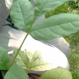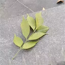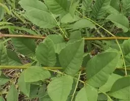 羽状复叶长5-15厘米;叶柄长2.5-4.5厘米,基部增厚;叶轴直,上面具窄沟,被细绒毛;小叶5-7枚,硬纸质,阔卵形,菱形至卵状披针形,长2-5厘米,宽1.5-3厘米,顶生小叶与侧生小叶几等大,先端尾尖,基部阔楔形,叶缘具深锯齿至缺裂状,两面均光滑无毛,中脉在两面凸起,侧脉4-6对,细脉明显网结;小叶柄短,长0.2-1.5厘米,被柔毛。