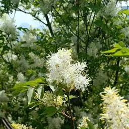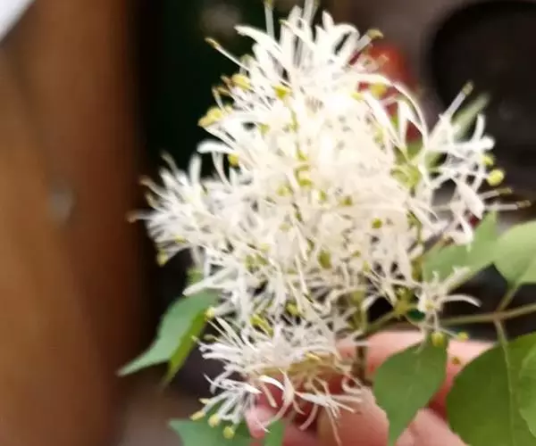 :圆锥花序顶生或腋生枝梢,长5-9厘米,疏被绒毛;花序梗扁平,长约1.5厘米,被细绒毛,渐秃净;花梗细,长约3毫米;雄花花萼小,杯状,萼齿尖三角形,花冠白色至淡黄色,裂片线形,长4-6毫米,雄蕊与裂片近等长,花药小,椭圆形,花丝细;两性花花萼较大,萼齿锥尖,花冠裂片长达8毫米,雄蕊明显短,雌蕊具短花柱,柱头2浅裂。