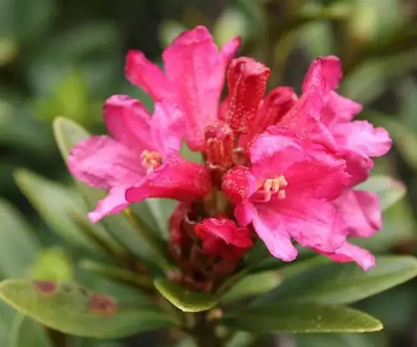 常绿小灌 高山杜鹃(图1) 木,高20-45(-100)厘米,分枝繁密,短或细长,伏地或挺直。幼枝密生锈棕色鳞片并杂有细柔毛,后渐脱落。叶芽鳞早落。叶常散生于枝条顶部,革质,长圆状椭圆形至卵状椭圆形,或长圆状倒卵形,长4-15(-25)毫米,宽2-5(-9)毫米,顶端圆钝,有短突尖头,基部宽楔形,边缘稍反卷,上面浅灰至暗灰绿色,无光泽,密被几邻接或重叠的灰白色鳞片,下面淡黄褐色至红褐色,密被淡黄褐和褐锈色相混生的二色鳞片,几相等,相邻接或重叠;叶柄长1.5-4毫米,被鳞片。