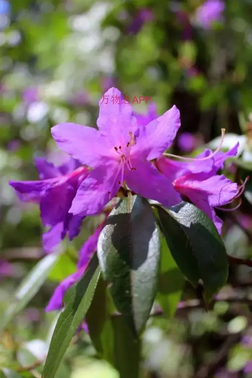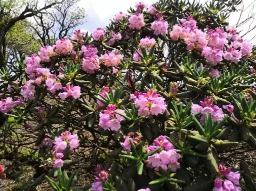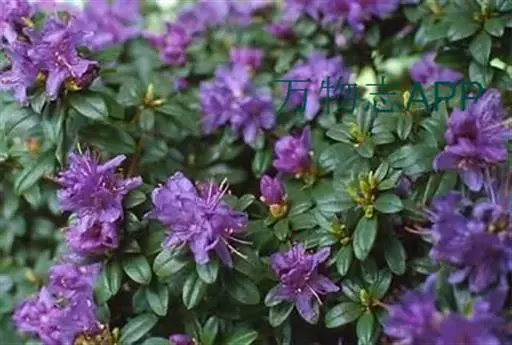 高山杜鹃(学名:Rhododendron lapponicum (L.) Wahl.):常绿小灌木,高可达1米,分枝繁密,伏地或挺直。叶常散生于枝条顶部,革质,上面浅灰至暗灰绿色,下面淡黄褐色至红褐色,叶柄被鳞片。花序顶生,伞形,有花数朵;花芽鳞脱落;花萼小,带红色或紫色,花冠宽漏斗状,淡紫蔷薇色至紫色,罕为白色,花丝基部被绵毛;蒴果长圆状卵形,5-7月开花,9-10月结果。