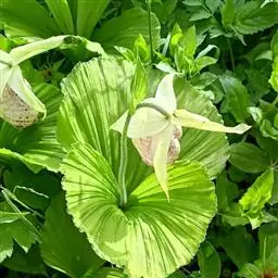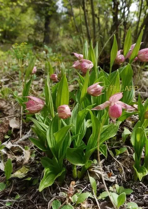 云南杓兰(学名:Cypripedium yunnanense Franch.):植株高20-37厘米,具粗短的根状茎。茎直立,无毛或在上部近节处疏被短柔毛,基部具数枚鞘,鞘上方具3-4枚叶。叶片椭圆形或椭圆状披针形。花序顶生,具1花;花略小,粉红色、淡紫红色或偶见灰白色,有深色的脉纹,退化雄蕊白色并在中央具1条紫条纹;花瓣披针形,长2.2-3.2厘米,宽7-8毫米,先端渐尖,稍扭转或不扭转,内表面基部具毛;唇瓣深囊状,椭圆形。花期5月。