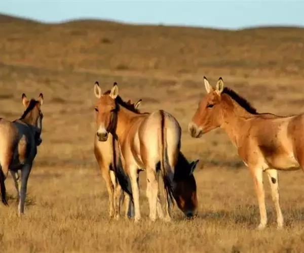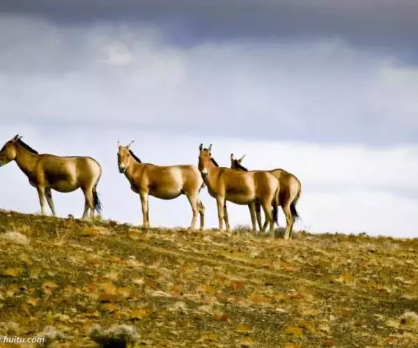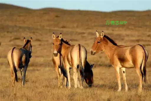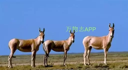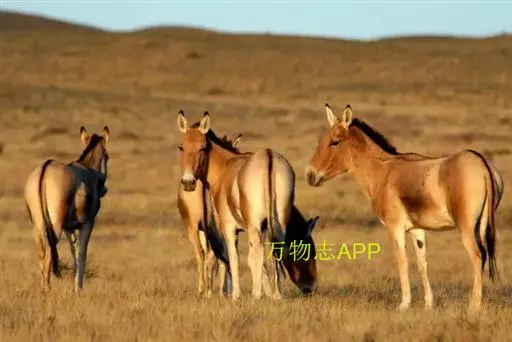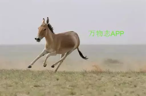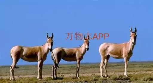蒙古野驴(学名:Equus hemionus):外形似骡,体型介于家驴和家马之间,体长可达260厘米,肩高约120厘米,尾长80厘米左右,体重约250千克。吻部稍细长,耳长而尖。尾细长,尖端毛较长,棕黄色。颈背具短鬃,颈的背侧、肩部、背部为浅黄棕色,背中央有一条棕褐色的背线延伸到尾的基部,颈下、胸部、体侧、腹部黄白色,与背侧毛色无明显的分界线。
