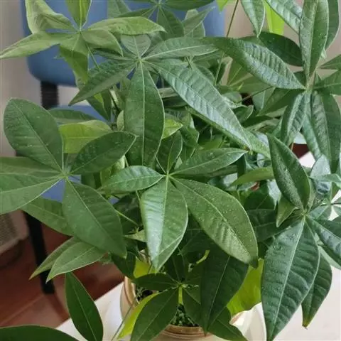 水瓜栗为掌状复叶,色彩墨绿,叶柄长10—25厘米,两端膨大成关节状;一片叶片中的小叶多为8枚,全缘,长l5—25厘米(—30厘米),先端宽为l0厘米左右,近基部渐狭,呈长倒卵形、倒卵状长椭圆形;小叶中部沿中脉下凹,状如小槽。叶的分布疏密度适中,采光和遮荫效果都好。