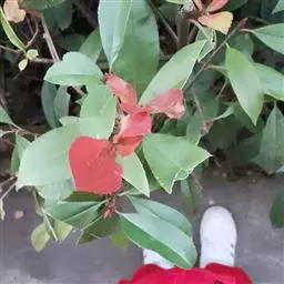 叶片为革质,且叶片表面的角质层非常厚。这也是叶片看起来非常光亮的原因。红叶石楠幼枝呈棕色,贴生短毛。后呈紫褐色.最后呈灰色无毛。树干及枝条上有刺。叶片长圆形至例卵状,披针形,长5-15厘米、宽2—5厘米,叶端渐尖而有短尖头,叶基楔形,叶缘有带腺的锯齿,叶柄长0.8-1.5厘米。花多而密,呈顶生复伞房花序。